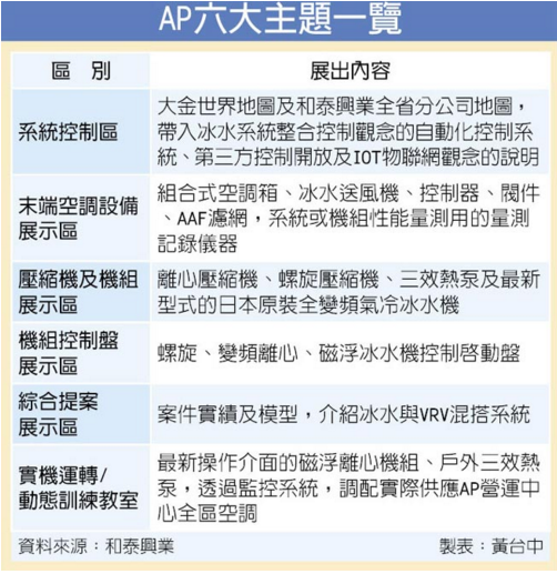 走入AP營運中心,開闊的迎賓時光廊區(qū)頓時吸引參訪者的目光,高達3層總數(shù)超過100只貨柜,建構(gòu)成強烈的工業(yè)風格鋼鐵城堡。右側(cè)展示VRV及家用系統(tǒng),中央主展廳則為AP系列產(chǎn)品的展示,展廳內(nèi)分為六大主題(見右表),大金全系列商品一覽無遺。