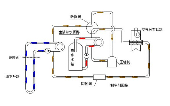 地源熱泵中央空調由于不受空氣環境溫度的影響,制冷供熱比普通中央空調效率高40%以上,特別在夏季酷熱時,風冷熱泵空調要從室外37度以上高溫環境吸取冷量相對困難,而地下溫度比較低,一般在18度左右,獲取冷量相對簡單很多。在冬季如果風冷熱泵采暖要在0度以下的環境中獲取熱量相當困難,這也是普通家用中央空調冬季采暖效果差的根本原因,而且還要反復除霜,頻繁起停耗能且效果差。冬季地源熱泵從地下獲取熱量供地暖與空調,效果好且不用除霜,高效節能。